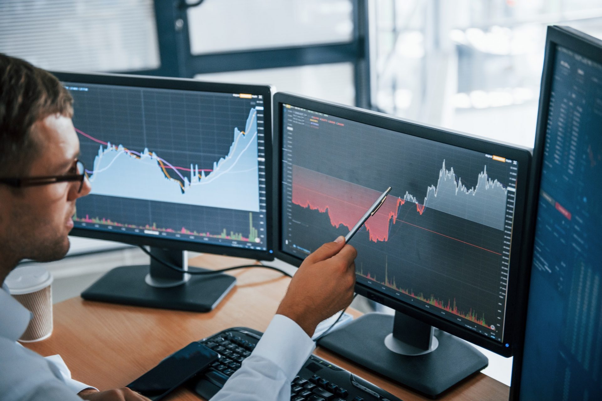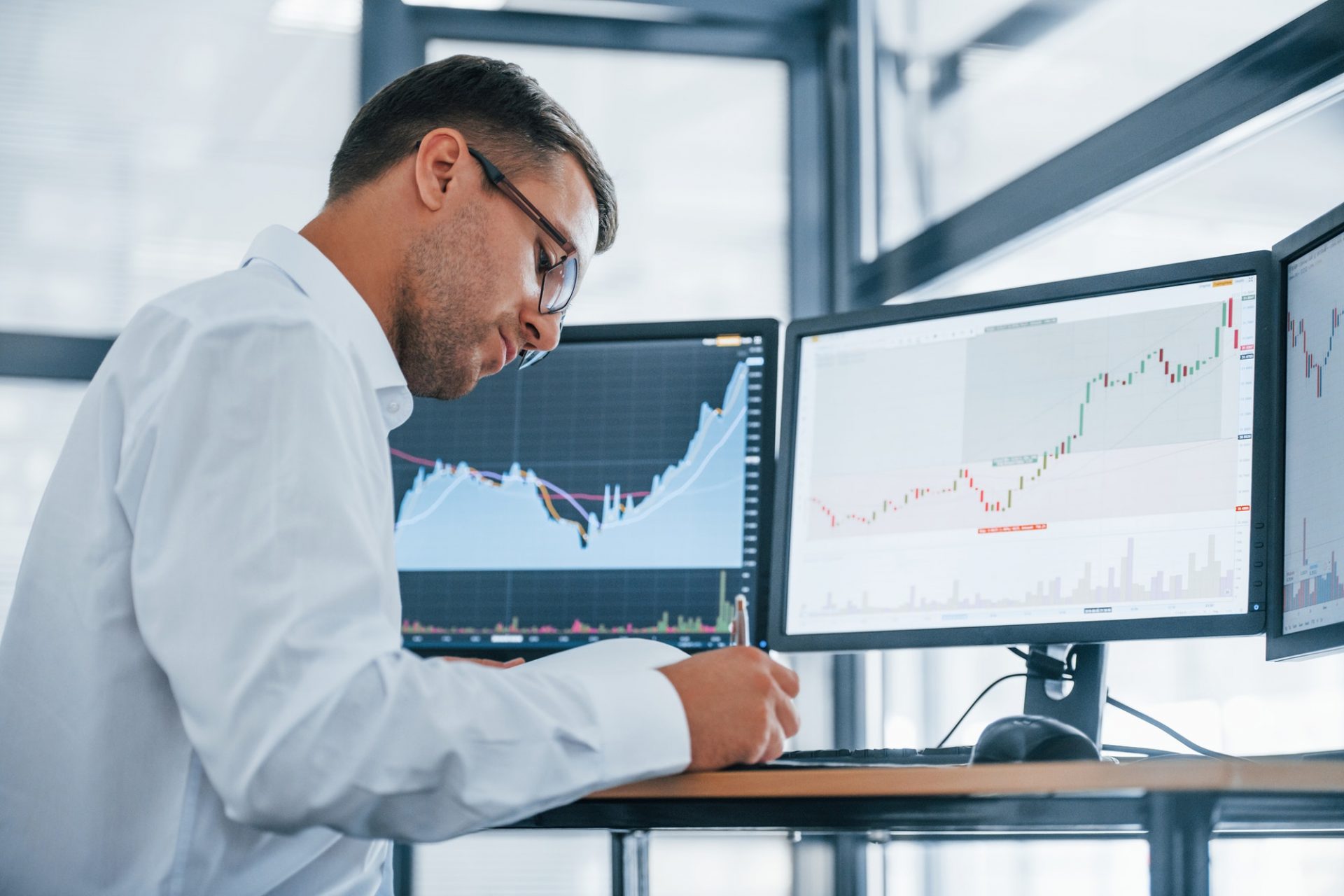 Young businessman in formal clothes is in office with multiple screens